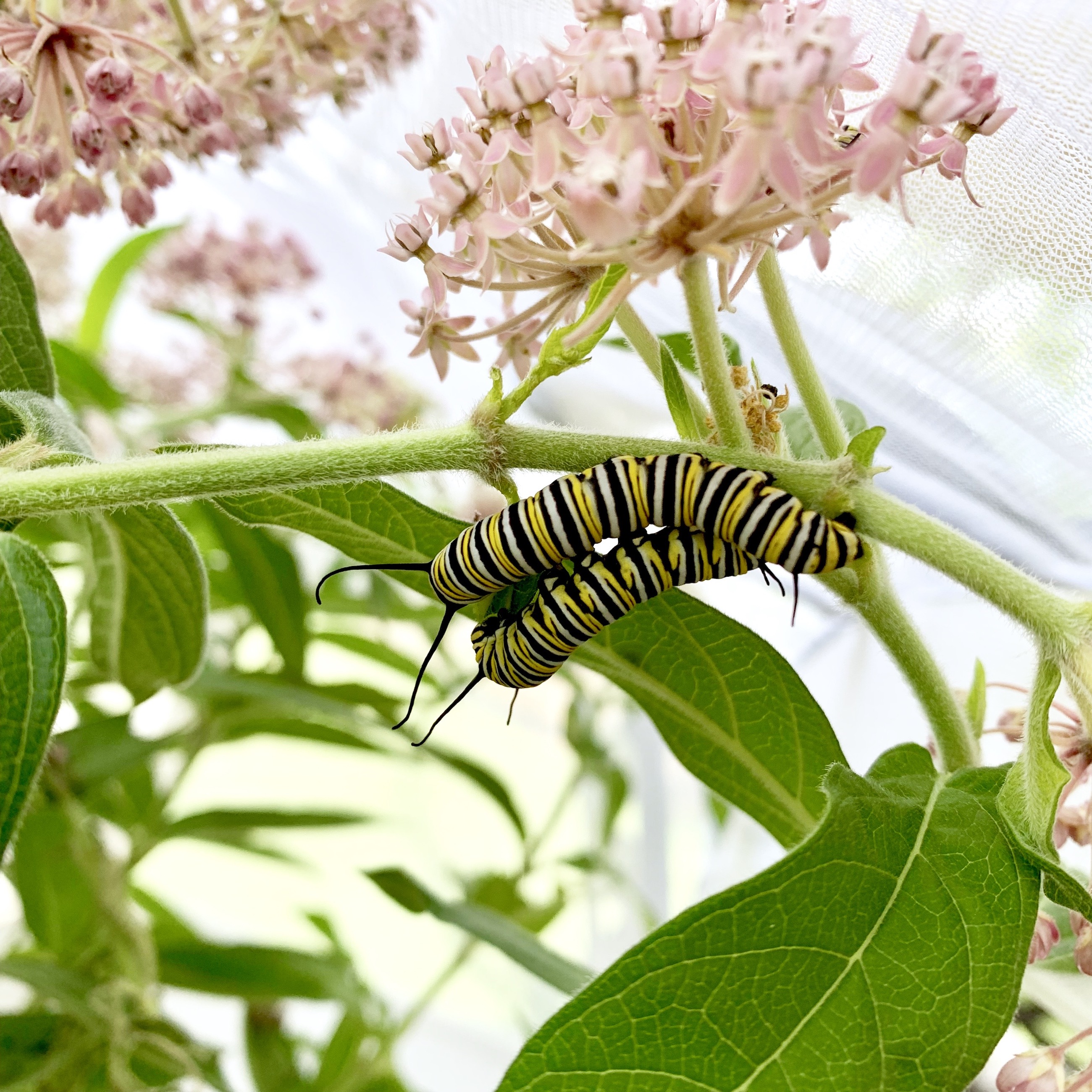 I should also add that I’ve tried providing the milkweed and sit back to watch nature do its thing. Monarchs would lay eggs, these eggs would hatch, and 0% would complete the cycle to turn into butterflies–between predators and storms, I watched them get wiped out daily. The safety of the roofed porch and net enclosure enables a much better success rate.