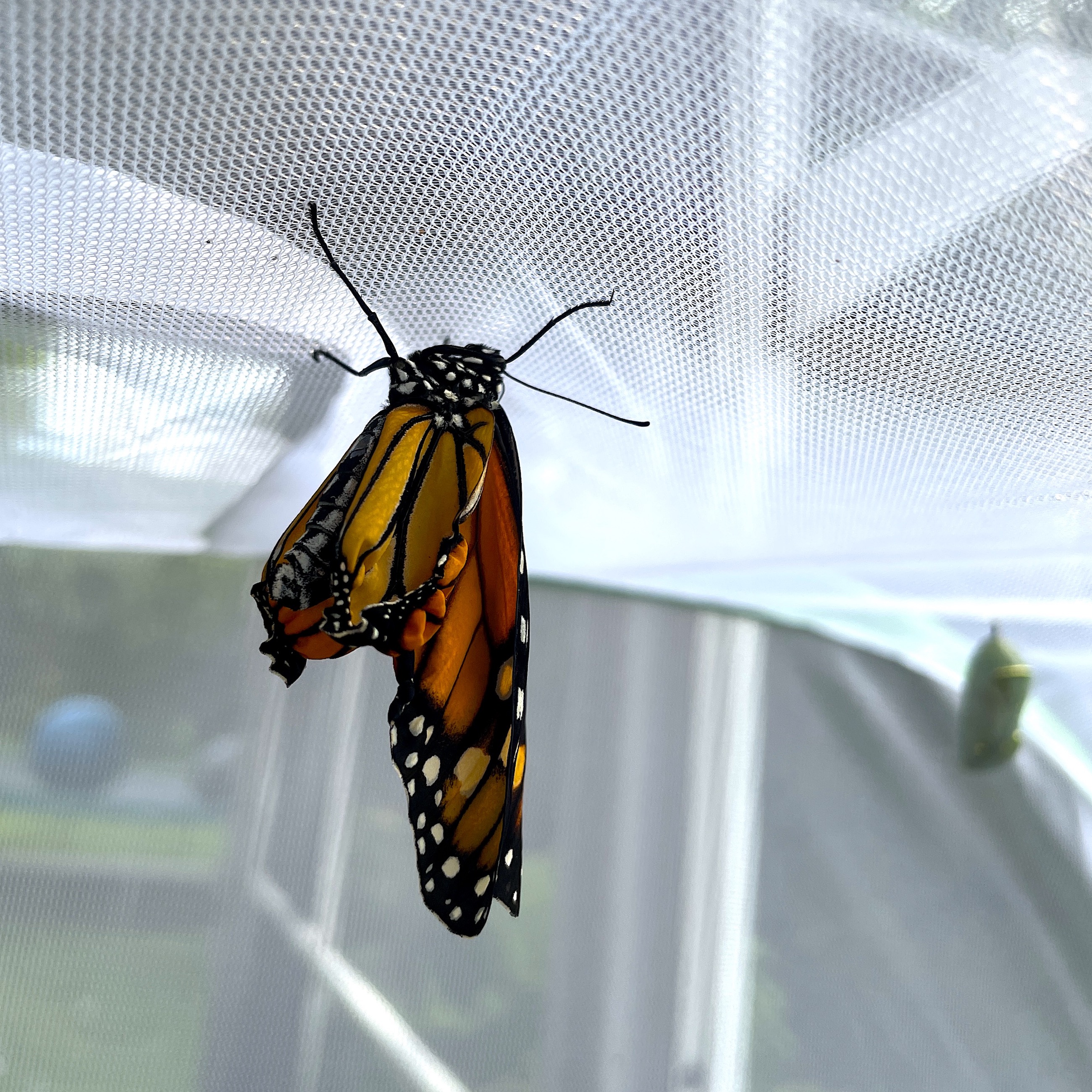 I place the container in a small netted enclosure and keep it on a covered porch until the butterflies emerge. It’s best to not maintain more than five or so in these small enclosures to ensure sanitation and general overcrowding are not an issue–they will fight if they get in each other’s way. They sort of head-butt a bit, so nothing too violent, but it’s best to make sure they are not getting stressed out.