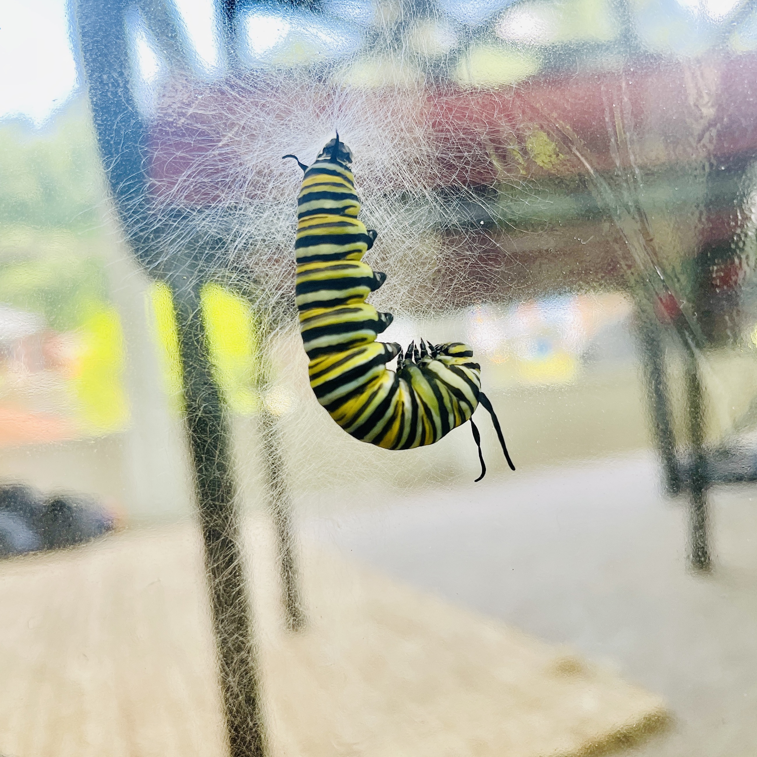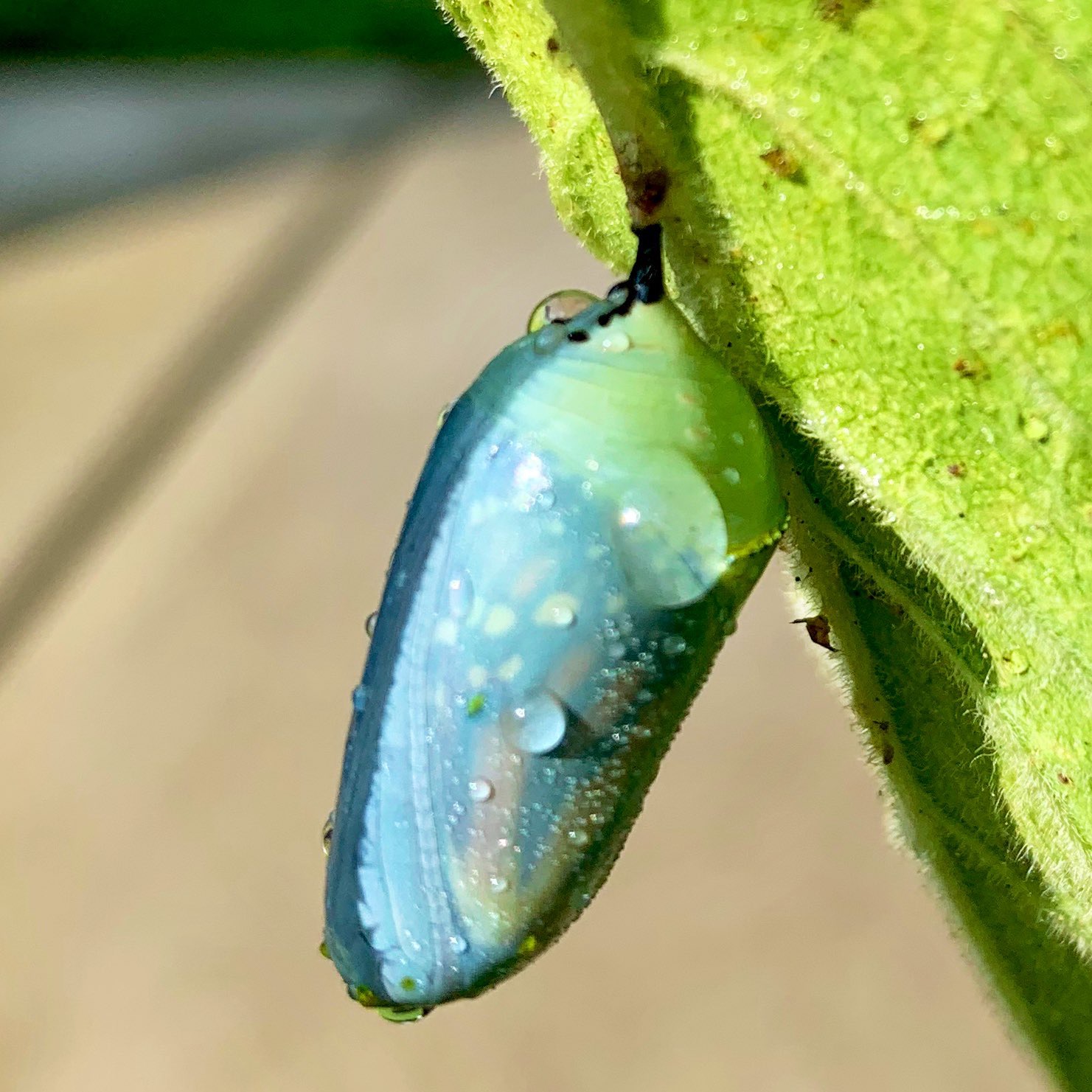 Monarch Caterpillars don’t create a little cocoon to live and transform in. They themselves turn into chrysalis–it’s amazing and weird. A newly formed chrysalis is very soft and fragile. On more than one occasion, I’ve seen a monarch form into a chrysalis only to have a hungry caterpillar cross its path and eat it. It’s all just green milkweed goo, and they don’t seem to know the difference.
